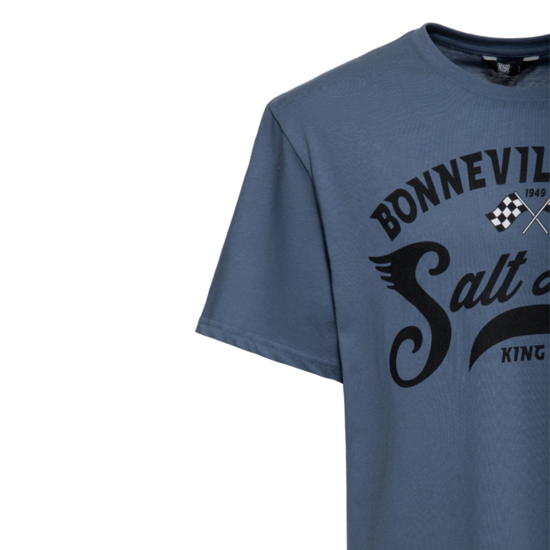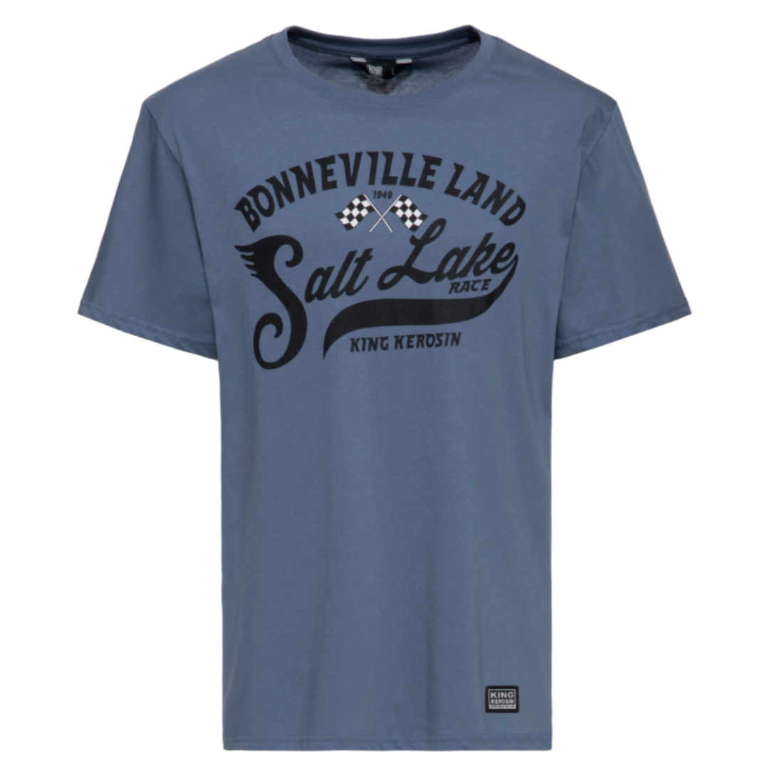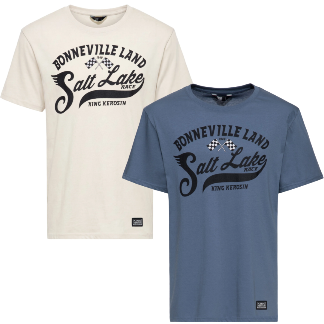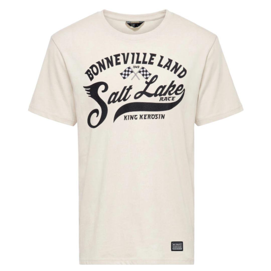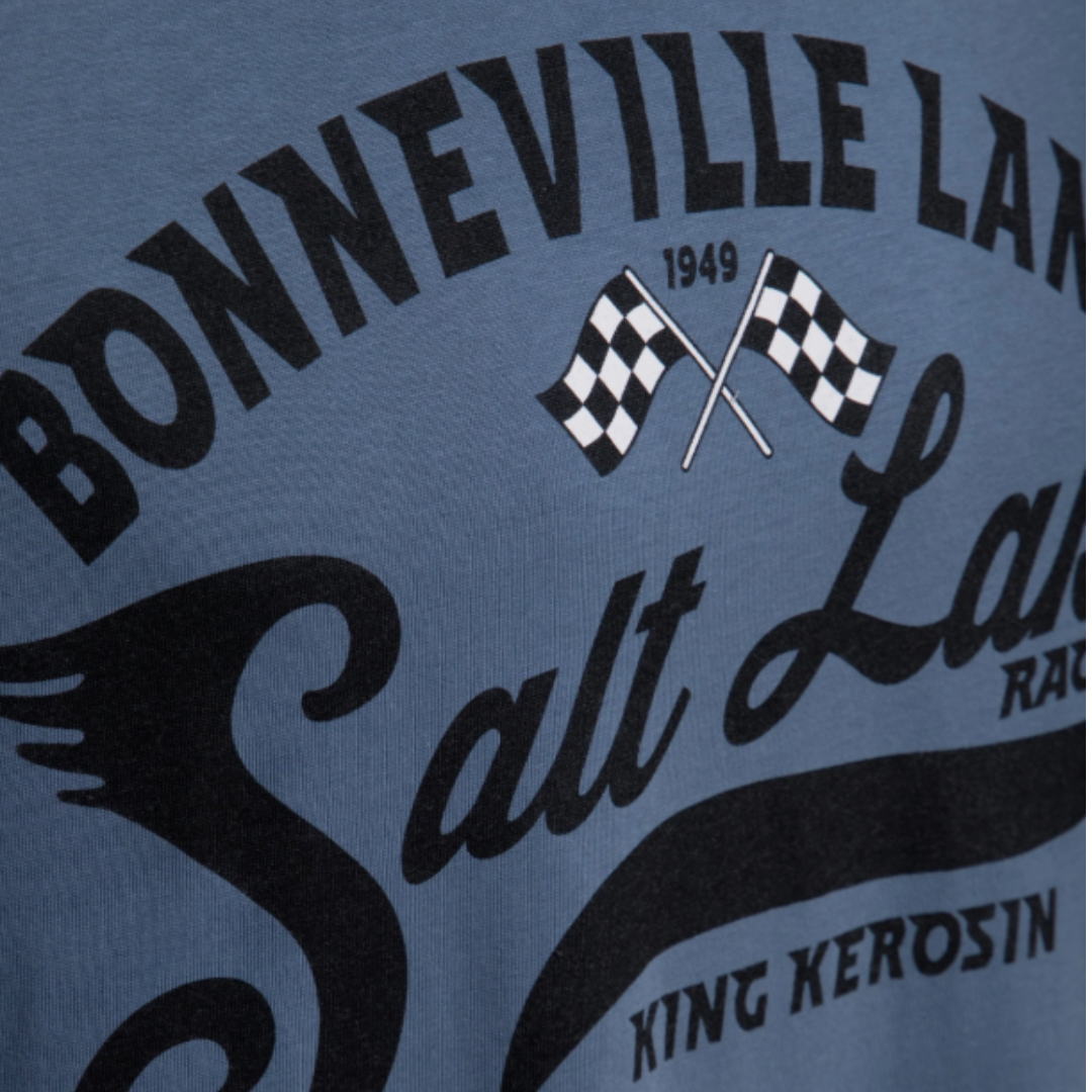 Racing-Geschichte zum Anziehen. Dieses King Kerosin T-Shirt greift mit seinem ausdrucksstarken Print die Welt der Highspeed-Runs auf den legendären Bonneville Salt Flats bei Salt Lake City auf. Der klassische Racing-Schriftzug zitiert eine der größten Ikonen des Straight-Line-Motorsports und bringt den Spirit kompromisslos auf die Brust.