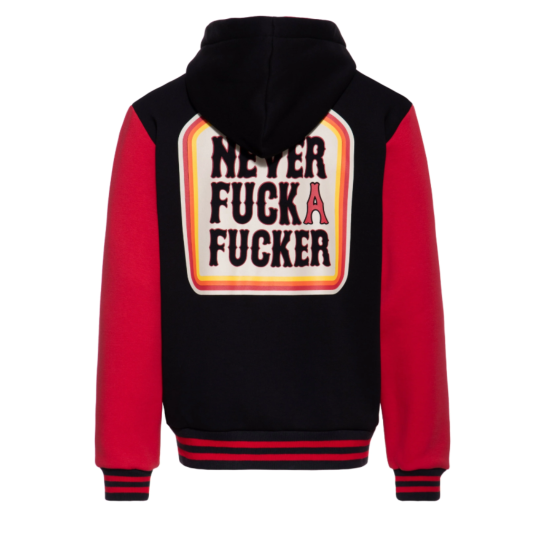 Diese King Kerosin Kapuzen-Sweatjacke lebt vom starken Kontrast aus klassischem College-Look und kompromissloser Aussage. Das großflächige Rückenmotiv „Never Fuck a Fucker“ ist plakativ gerahmt und bewusst dominant platziert – ein klares Statement ohne Umwege.