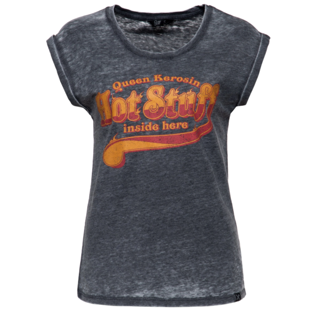 Queen Kerosin Damen T-Shirt „Hot Stuff inside here“ – 70s Retro mit Enzyme-Wash